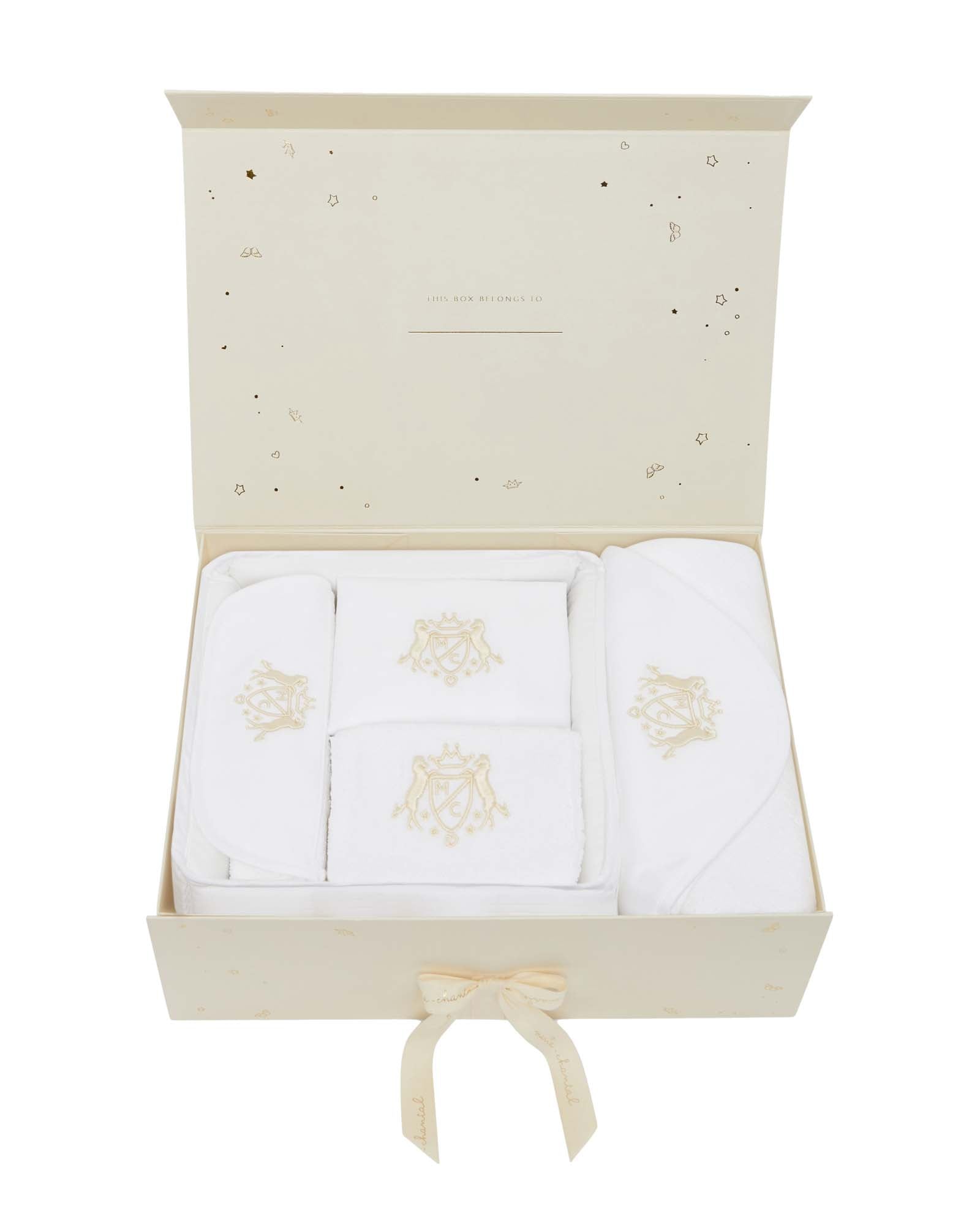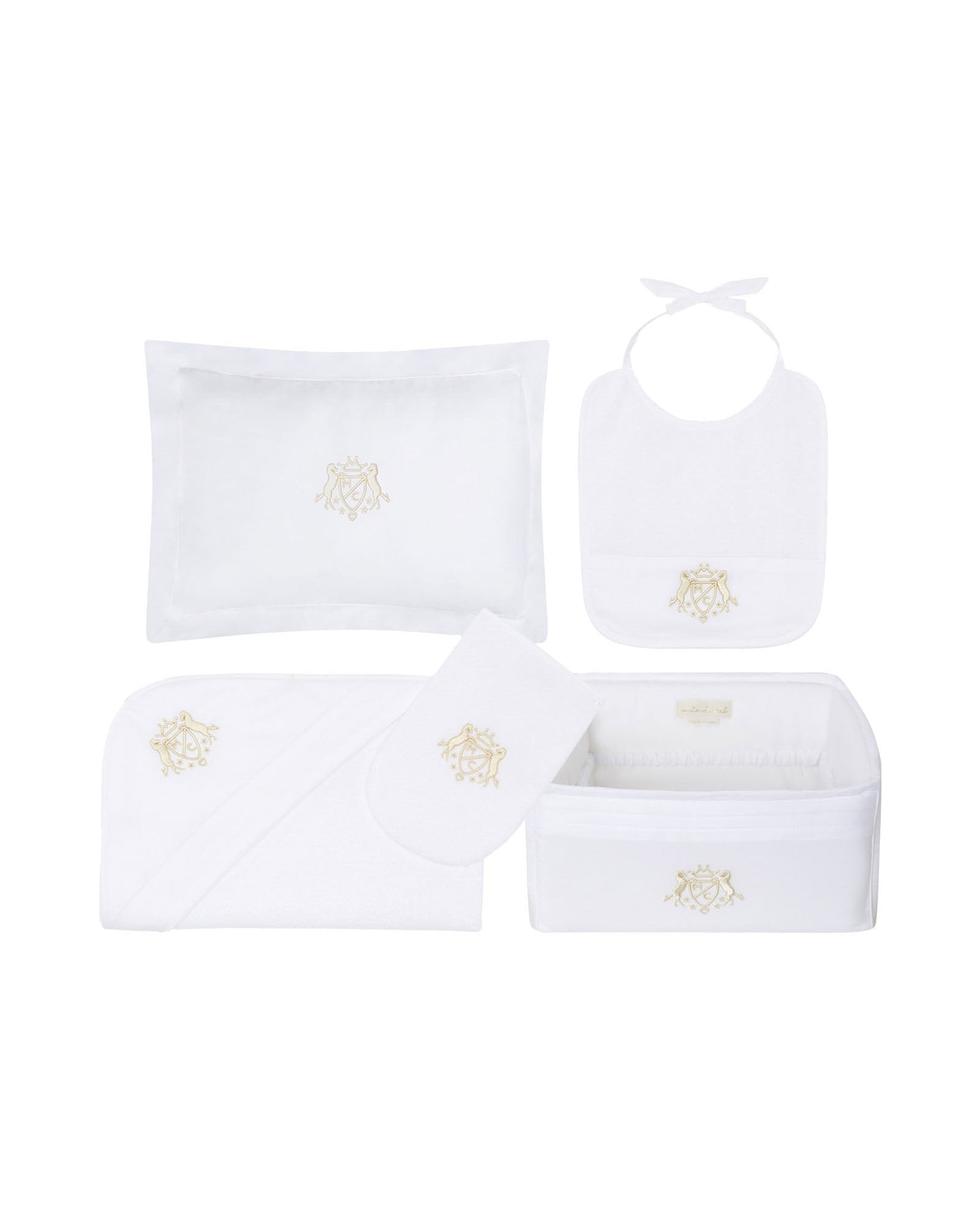 Includes pillow, bib, burp cloth, hooded towel, and storage basket
